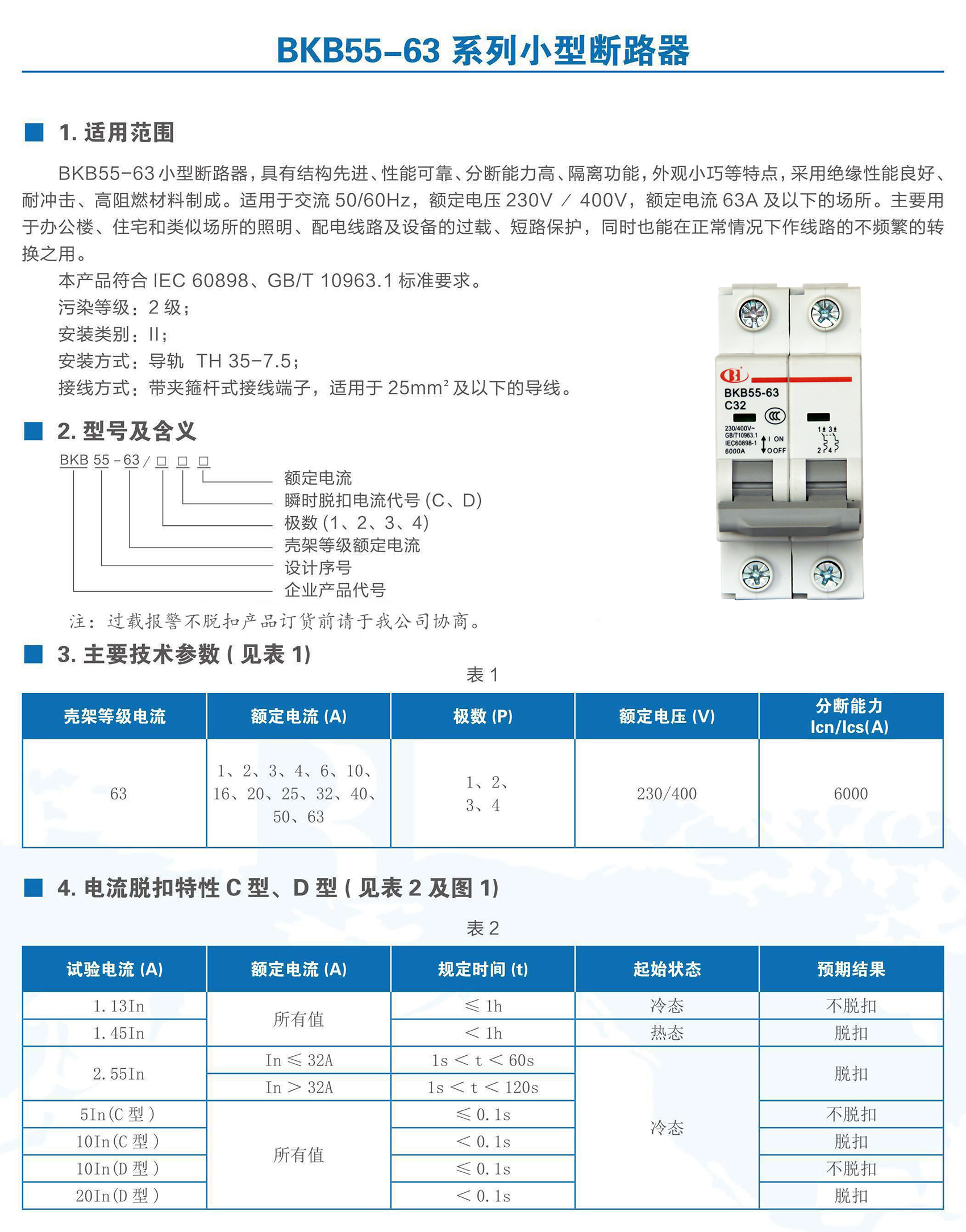 BKB55-63系列小型断路器适用于交流50/60Hz,额定电压至400V,额定电流1~63A,额定绝缘电压500V的系统线路中。用来对建筑电厂、变电站、电信、交通、冶金、工矿业等及类似场所的系统线路、电气设备进行过电流保护,也可以用于不频繁的通断操作。适用于非专业人员使用且不需要进行维护。本产品符合GB/T 10963.1、IEC 60898-1标准。